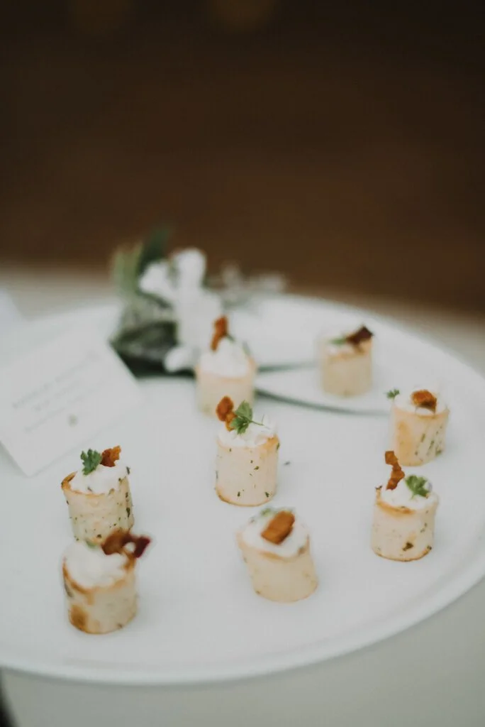 A small savory dish served as an appetizer, typically during cocktail hour. These can be passed or plated.